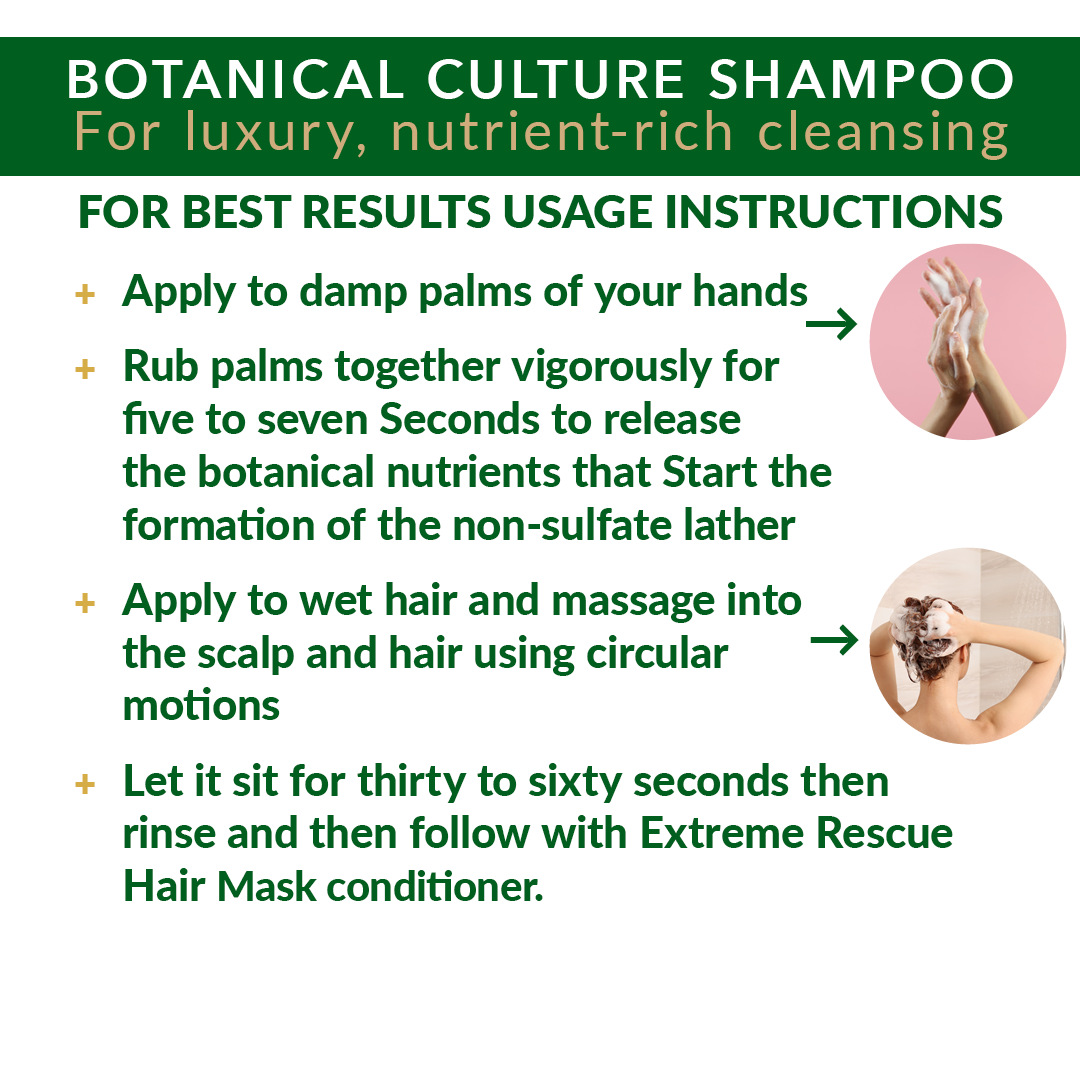 Wet hair thoroughly. Apply a generous amount of HLM Botanical Culture Shampoo